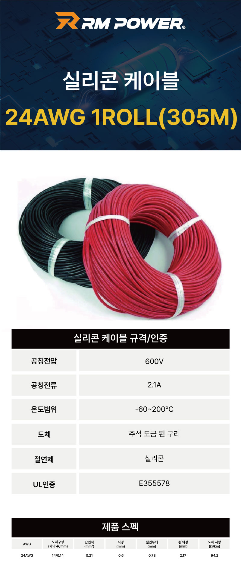UL 인증 실리콘 케이블 24AWG 1ROLL(305M)